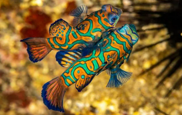 Pez mandarín (Synchiropus splendidus), que es toda una explosión de color. Sus vibrantes patrones azules, naranjas y amarillos lo convierten en una de las criaturas más bellas del mar. Estos patrones psicodélicos sirven como advertencia para los depredadores potenciales, indicando que la piel del pez secreta una mucosidad tóxica.