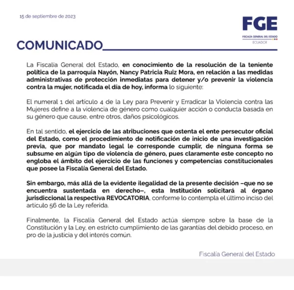 La Fiscalía General del Estado (FGE) rechazó, mediante un comunicado oficial esta decisión de la teniente política de la parroquia de Nayón.