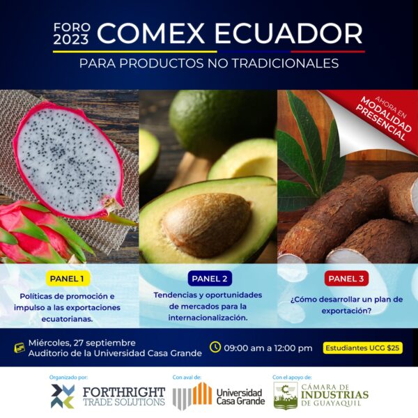 Este 27 de septiembre, la Universidad Casa Grande y Forthright Trade Solutions presentarán dos eventos que evocan a revisar diversos puntos relacionados al comercio internacional. Uno de ellos es FORO COMEX 2023 donde diferentes especialistas compartirán sus experiencias sobre temas relacionados a la exportación de productos no tradicionales ecuatorianos.