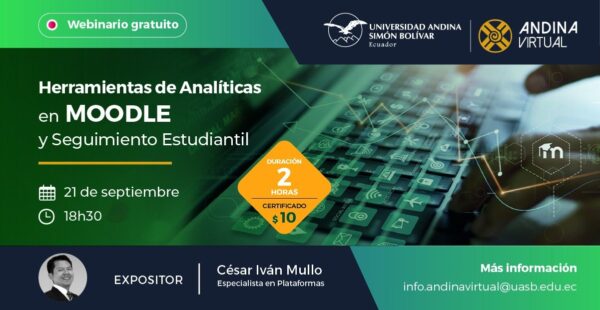 La Unidad de Gestión de Educación Virtual de la Universidad Andina Simón Bolívar, Sede Ecuador invita al webinario “Herramientas de analíticas en Moodle y seguimiento estudiantil”.