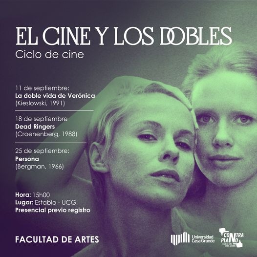 Te invitamos a un nuevo ciclo de Contraplano, el club de cine de la Facultad de Artes. Acompáñanos a ver cómo diversos directores han explorado personajes que conviven con un doble: dos jóvenes idénticas que viven en diferentes partes del mundo, dos hermanos gemelos que comparten la misma profesión y dos mujeres cuyas identidades se mezclan serán los protagonistas de este ciclo.