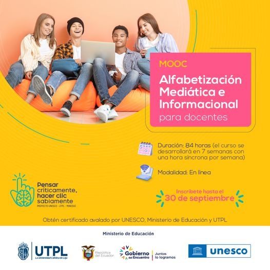 👩🏻🏫👨🏻💻 𝗠𝗢𝗢𝗖 𝗴𝗿𝗮𝘁𝘂𝗶𝘁𝗼 ↪️ El grupo de investigación “Comunicación, Educación y Tecnología” de la UTPL invita a docentes a participar en el MOOC 💻 “Alfabetización mediática e informacional”, que busca ser una valiosa herramienta para facilitar la integración de la educación mediática en las aulas universitarias. 🎓