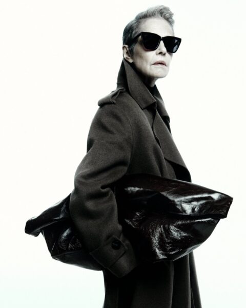 Ante el objetivo del célebre fotógrafo alemán Juergen Teller, Maggie Smith (Ilford, Reino Unido) derrocha carisma, elegancia y naturalidad con un abrigo de piel sintético y el bolso «Puzzle», creado por el director creativos de Loewe Jonathan Anderson.