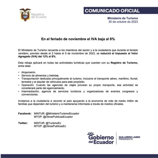 En un comunicado hecho público en su red X recordó al sector turístico y a la ciudadanía que durante el feriado a nivel nacional previsto desde el 2 hasta el 5 de noviembre de 2023, se reducirá el IVA del 12% al 8%.
