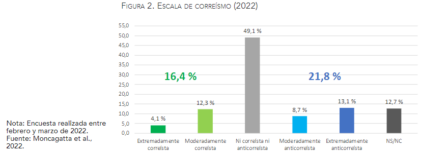 La Figura 2 ilustra las respuestas a una pregunta de encuesta muy similar, con la diferencia de que la encuesta fue realizada entre los meses de febrero y marzo de 2022. La pregunta de encuesta utilizada en esta medición fue: “Respecto al correísmo, usted se considera…”, ofreciendo de la misma manera cinco posibles categorías de respuesta: “Extremadamente anticorreísta”, “Moderadamente anticorreísta”, “Ni correísta ni anticorreísta”, “Moderadamente correísta” y “Extremadamente correísta”. Como se puede ver, el porcentaje de “anticorreístas” en esta gráfica es muy similar al de la Figura 1, de aproximadamente un 20%.