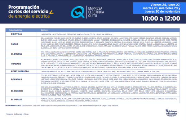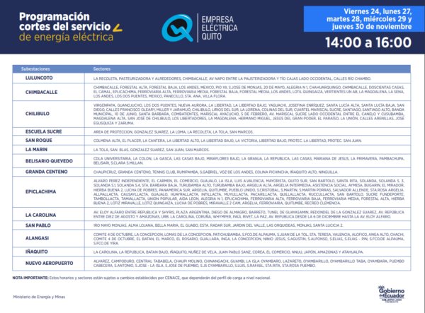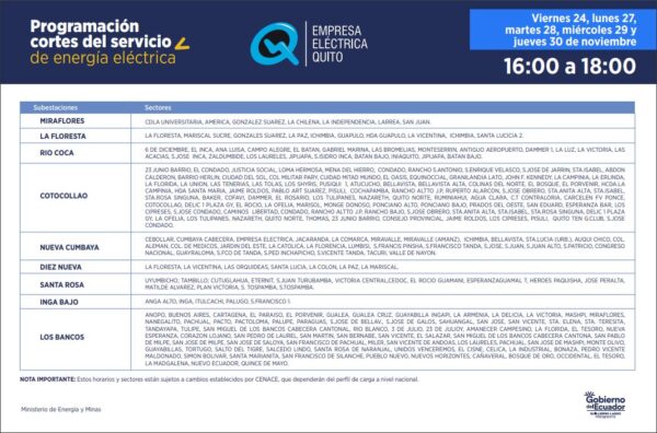 Desde este viernes, 24 de noviembre del 2023, regresan los cortes puntuales de luz en el país. En ese sentido, la Empresa Eléctrica Quito publicó los horarios que regirán para el viernes 24 y del lunes 27 al jueves 30 de noviembre del 2023.
