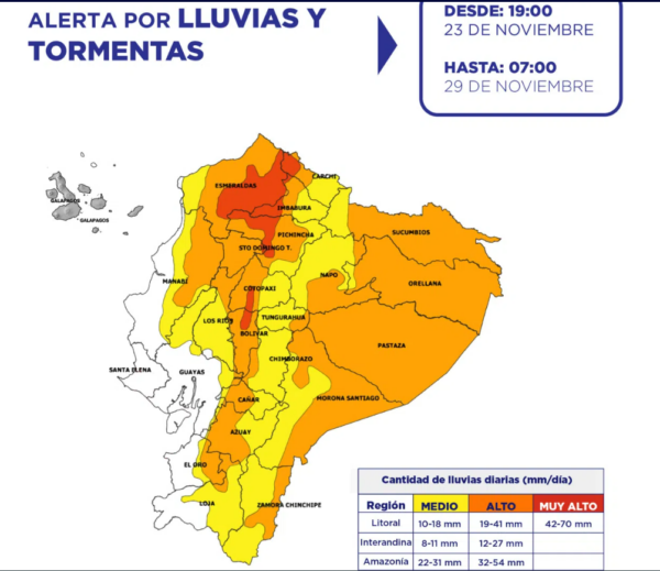 No obstante, de acuerdo con el Instituto Nacional de Meteorología, el 24 y 28 de noviembre será los días con lluvias más intensas. Las zonas afectadas serán las ubicadas en el norte y centro de la Costa y Sierra y con menor intensidad en el norte de la Amazonía.