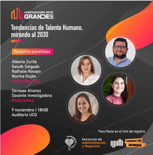 La Universidad Casa Grande invita a una nueva edición de “Conversaciones entre Grandes”, denominado “Tendencias de Talento Humano, mirando al 2030”, en donde tendremos como panelistas a graduados de la carrera de Gestión de Talento Humano. Los expositores abordarán temas como Estructura Sostenible y Estrategia DEI (Diversidad, Equidad e Inclusión), Comunicación Interna Estratégica, Employer Branding y Wellness Organizacional.