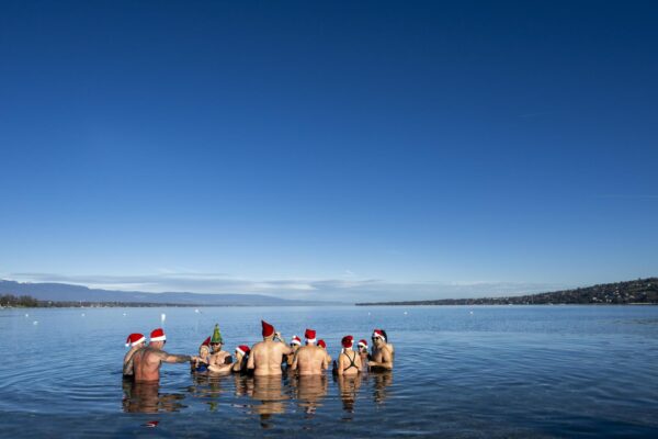 Ginebra (Suiza), 24/12/2023.- La gente nada con gorros de Papá Noel en agua a 8 grados en el lago Leman, en Bains des Paquis en Nochebuena, en Ginebra, Suiza, 24 de diciembre de 2023. (Suiza, Ginebra)