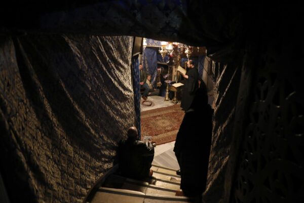 Un sacerdote celebra una misa en la gruta de la Iglesia de la Natividad en la ciudad de Belén, en Cisjordania, el 24 de diciembre de 2023. Los líderes de la iglesia en la histórica ciudad cristiana de Belén, tradicionalmente venerada como el lugar de nacimiento de Jesús, han anunciado la cancelación de la Navidad pública. celebraciones este año en solidaridad con el pueblo de Gaza en medio del actual conflicto entre Israel y Gaza. Las actividades navideñas se limitarán al culto y la oración, sin las habituales luces navideñas ni el árbol. EFE/EPA/Wisam Hashlamoun