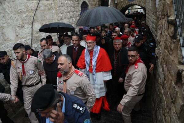 El Patriarca Latino de Jerusalén Pierbattista Pizzaballa llega a la Plaza del Pesebre para asistir a la Misa de Navidad de medianoche en la Iglesia de la Natividad, en la ciudad de Belén, en Cisjordania, el 24 de diciembre de 2023. Líderes de la Iglesia en la histórica ciudad cristiana de Belén, tradicionalmente venerados como el lugar de nacimiento de Jesús, han anunciado la cancelación de las celebraciones públicas de Navidad este año en solidaridad con el pueblo de Gaza en medio del actual conflicto entre Israel y Gaza. Las actividades navideñas se limitarán al culto y la oración, sin las habituales luces navideñas ni el árbol. (Jerusalén) EFE/EPA/Wisam Hashlamoun