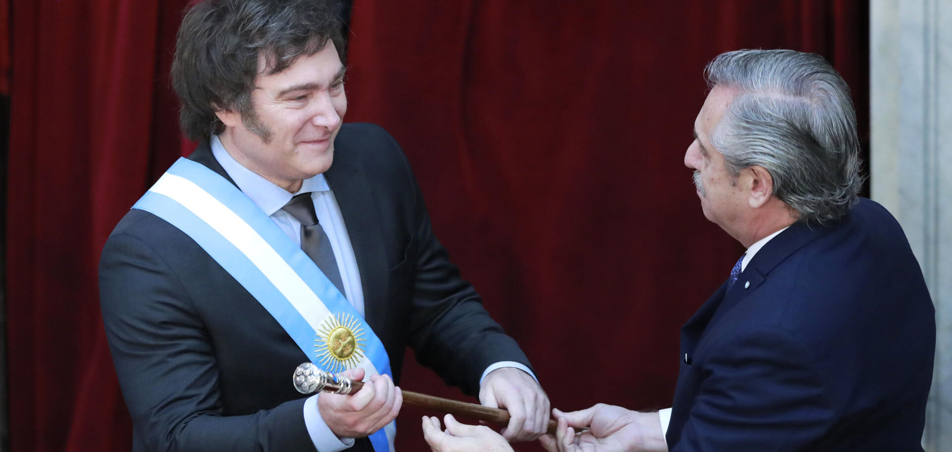 Posteriormente, recibió la banda y el bastón presidenciales de manos del mandatario saliente, Alberto Fernández, quien le estrechó la mano y dijo unas breves palabras, tras lo cual salió del recinto.