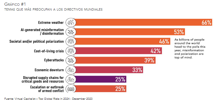 gobernabilidad. El aumento de flujos migratorios se ubica en el quinto lugar, actualmente el mundo alberga a 7.7 millones de migrantes venezolanos, y eso ha generado tensiones sociales y conflictos entre los migrantes y las comunidades receptoras, especialmente en Colombia, Chile, Ecuador y Perú. La radicalización de las protestas sociales (sexto), en un escenario económico mediocre y altos niveles de desconfianza hacia las instituciones públicas, aparece nuevamente como un riesgo que podría regresar.