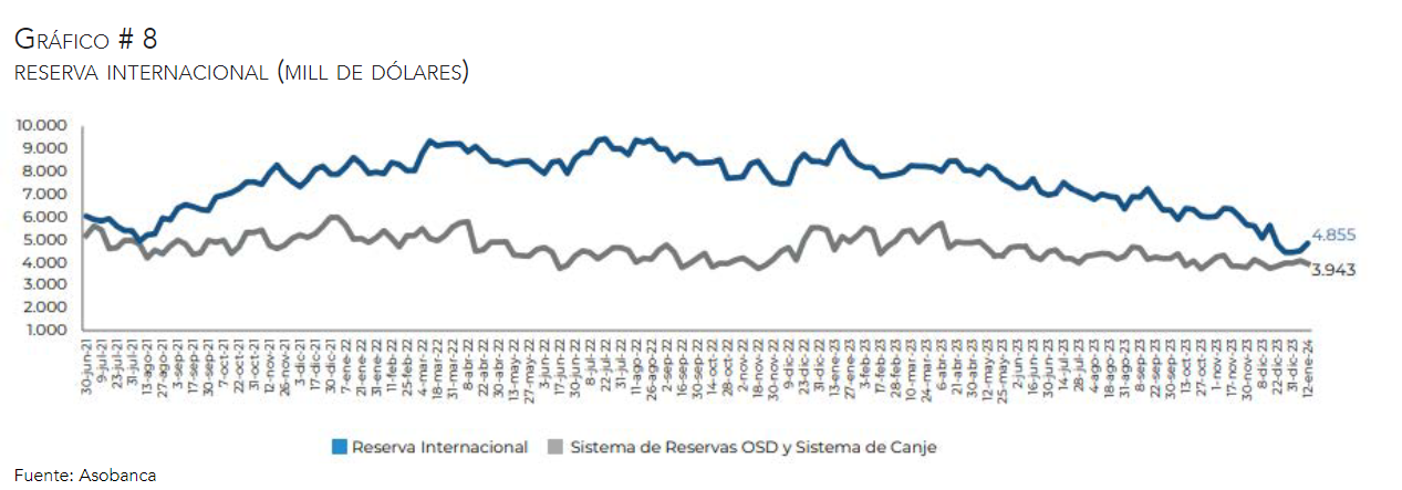 c)La reserva internacional ha bajado sustancialmente (ver gráfico #7) como reflejo de que hay más salida que entrada de dólares en la economía, como cuando la liquidez y/o capital de trabajo en una empresa disminuyen. Punto aceptable: aunque ha disminuido, la reserva aún cubre más del 100% de los depósitos del sistema financiero, lo cual es sano.