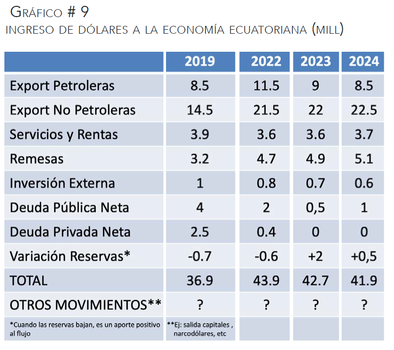 d)Sin duda hay un freno de la entrada de dólares a la economía. En el gráfico #8, hago una estimación de cuántos dólares (“oficiales”) entran anualmente a la economía ecuatoriana, se ve claramente que 2023 y 2024 son años de menores entradas y eso obviamente no es bueno en cuanto a la actividad económica. PERO OJO, esto de ninguna manera quiere decir que la dolarización esté en riesgo, porque la economía se acomoda cuando hay más o hay menos dólares, en particular vía crecimiento económico.