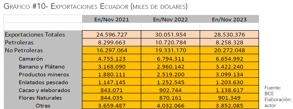 El primero y más atractivo: la capacidad exportadora del sector privado ecuatoriano (ver gráfico #9). Muy sencillo, de 2021 a 2023 (enero a noviembre de cada año) hemos crecido de $16 mil a $20 mil millones de dólares, con 6 productos que se sitúan alrededor de los $1.000 millones anuales: camarón, banano, minería (a pesar de que muchos intentan impedir que se desarrolle, cuando más bien hay que frenar la minería ilegal), enlatados de pescado, cacao y elaborados, flores. Y vienen detrás otros productos como la pitahaya.