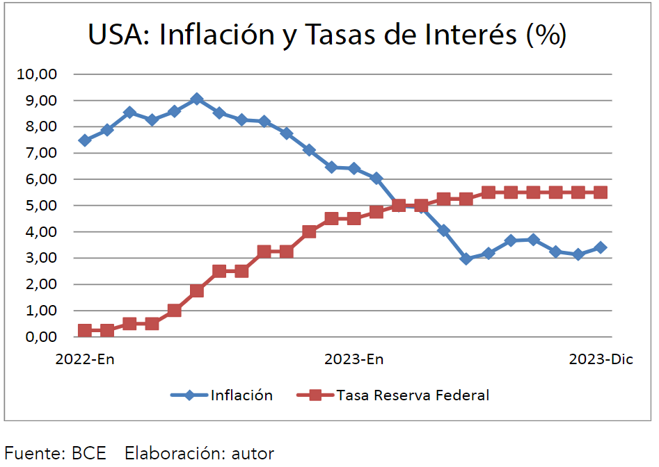 Obviamente está el tema de la inflación, para el cual tomaremos como referencia a los EEUU. Como muestra el gráfico #2, el alza de los intereses ha permitido una baja importante de la inflación, y eso ha llevado a pensar que las tasas de interés podrían ya bajar en el 2024. Sin embargo, la pelea no está aún ganada, la inflación se ha estabilizado alrededor del 3/3,5% cuando el objetivo es el 2%. Hay 3 escenarios posibles, como muestra el cuadro #1. Y este tema es muy importante en particular para nosotros, porque ya hemos sufrido la presión al alza de las tasas de interés en Ecuador, y porque el valor del dólar en el mundo, en gran parte dependerá de cómo se muevan los intereses en dólares respecto al de otras zonas. Por ejemplo se fortaleció frente al euro cuando los intereses en EEUU subían más, y en cambio se debilitó frente al peso colombiano cuando en Colombia las tasas de interés se acercaron al 15%.