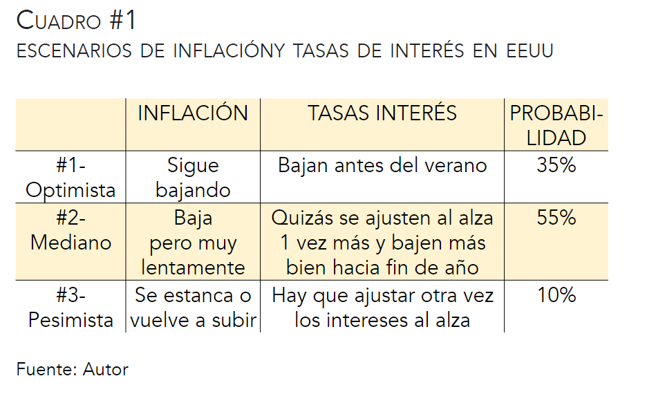 En cuanto al crecimiento, este se ha mantenido relativamente sólido en EEUU, a pesar de la elevación de los intereses. La teoría económica nos dice que eso es muy explicable bajo la visión de que la gente tiene expectativas racionales cuando anticipa positivamente la política de la Reserva Federal (si la gente tuviera expectativas constantes o adaptativas, tomaría más esfuerzo y recesión convencerle de adaptar rápidamente su expectativas a la baja). En el escenario #1 la economía mantendría su empuje, en el #2 quizás se frene hasta que se confirmen los resultados sobre inflación, y en el #3 ciertamente se entraría en recesión … Y a esto habría que agregar un entorno internacional poco sólido y en particular donde uno de sus motores como es la China, está sufriendo un triple impacto: deuda al alza, sector inmobiliario en caída y disminución de la población, y además el frenazo de Alemania que afecta a toda la eurozona.