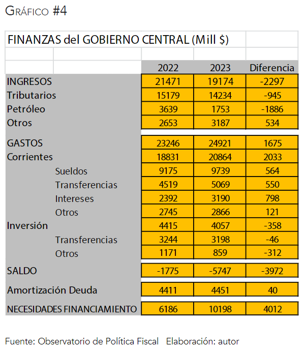 Efectivamente muy mala. El gráfico #4 la muestra en detalle para el Gobierno Central. En 2022 la situación fue bastante razonable pero recordemos que entonces el precio del petróleo ecuatoriano fue en promedio 90$ por barril, había el impuesto excepcional a los patrimonios y la nueva tabla de Impuesto a la Renta. En 2023, ya no hay esas ventajas (el petróleo en $60), y el gasto corriente creció por mayores sueldos ($500 millones), aportes a la seguridad social (+$500 millones) e intereses de la deuda (+800 millones), con lo cual el déficit aumenta en casi $4.000 millones y las necesidades de financiamiento (déficit + amortización de deudas) de $6.186 millones a $10.198 millones! Obviamente como el gobierno no pudo conseguir este último monto, tuvo que dejar atrasos por más de $4.000 millones: seguridad social, proveedores, etc. Y ahora hay que pagar la factura, porque 2024 será similar o peor.