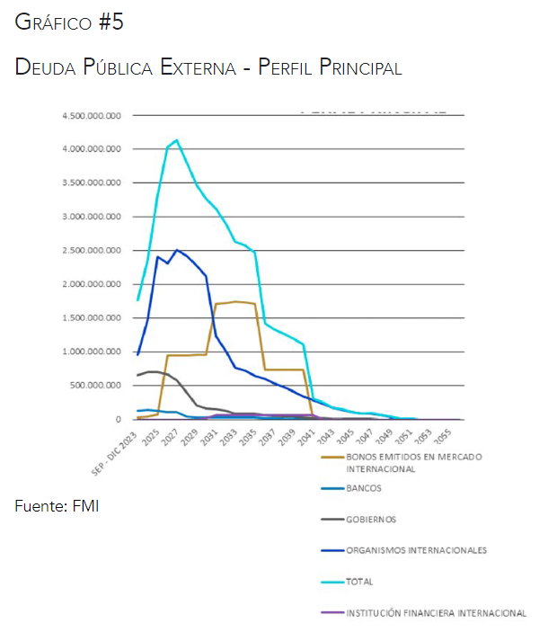¿Pagos? En intereses en el 2023 se fueron $3.000 millones y en amortizaciones alrededor de $5.000 millones, ambos aspectos juntos: $8.000 millones. Mientras tanto captamos unos $9.000 millones, lo cual implica que usamos endeudamiento para pagar intereses y amortización de la deuda … y además sobraron $1.000 millones para ser utilizados por el gobierno. Como nada es gratuito, la contraparte es que la deuda total aumentó en $4.000 millones (9.000 – 5.000). Y si bien estos años los pagos han sido manejables en deuda externa por la renegociación de bonos en 2020 y de la deuda china en 2022, vemos en el gráfico #5 cómo van aumentando y desde 2025 otra vez se vuelven difíciles de asumir, y ahí el riesgo de un nuevo “default” (el Presidente Noboa lo dijo en Nueva York).