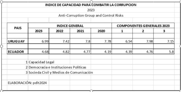 Uruguay tiene la mejor capacidad para luchar contra la corrupción. Su Calidad General de la Democracia es el más alto de la región (9.5/10.0) y la Independencia y eficacia de Judicial es de 8.2. En el caso de Ecuador, los peores registros son: Procesos Legislativo (3.2), Independencia de la Fiscalía General y de sus agentes (3.5) e Independencia y eficacia Judicial (4.0).