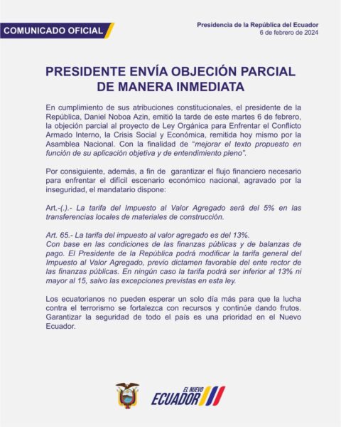 El documento de 19 páginas fue emitido contrarreloj. El presidente Daniel Noboa objetó parcialmente el proyecto de Ley Orgánica para Enfrentar el Conflicto Armado Interno, la Crisis Social y Económica. Insiste en que subir el Impuesto al Valor Agregado (IVA) del 12% al 13% en Ecuador.