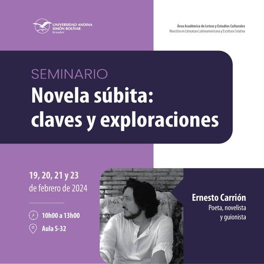 📚✨ 📚✨ Descubre los secretos de la escritura narrativa en el seminario presencial “Novela Súbita: Claves y Exploraciones” con el docente Ernesto Carrión. 🖋️🌟