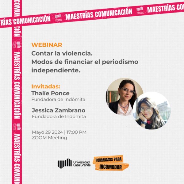 La Universidad Casa Grande invita al webinar: “Contar la violencia, modos de financiar el periodismo independiente” dictado por Jéssica Zambrano y Thalie Ponce, fundadoras del medio digital Indómita, quienes explicarán el tipo de trabajo que están realizando y cómo conseguir vías de financiamiento para narrar de manera independiente lo que nos ocurre como sociedad.