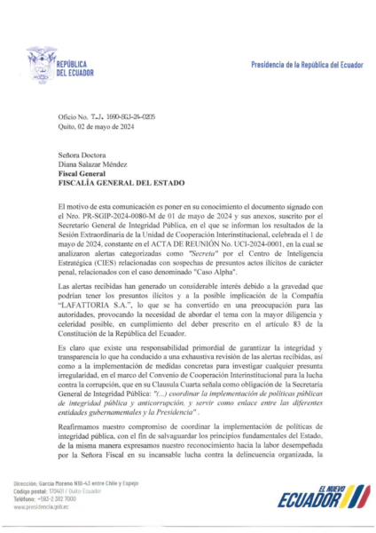 El Gobierno de Daniel Noboa pidió la Fiscalía que investigue presuntos actos ilícitos que involucrarían a la compañía  Lafattoria S. A, proveedora de alimentación en las cárceles en Ecuador. El hecho se conoció tras la divulgación de un oficio para la fiscal Diana Salazar este jueves 2 de mayo del 2024.