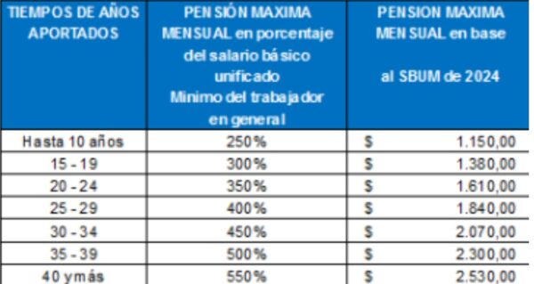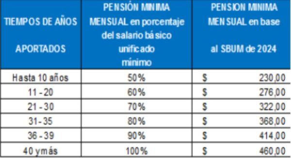 Estos montos se establecen de acuerdo al tiempo de aportación y es proporcional a salario básico unificado del trabajador, la siguiente tabla detalla los valores de las pensiones mínimas y máximas durante este 2024: