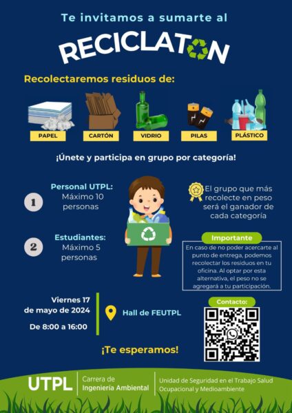 En la Universidad Técnica Particular de Loja, el próximo 17 de mayo se desarrollará el segundo reciclaton institucional, este evento se celebra en conmemoración al Día Internacional del Reciclaje y está siendo organizado por la carrera de Ingeniería Ambiental y la Unidad de seguridad en el trabajo, salud ocupacional y medioambiente de UTPL, en el año 2023 se recolectó un total de 873,78 kg.