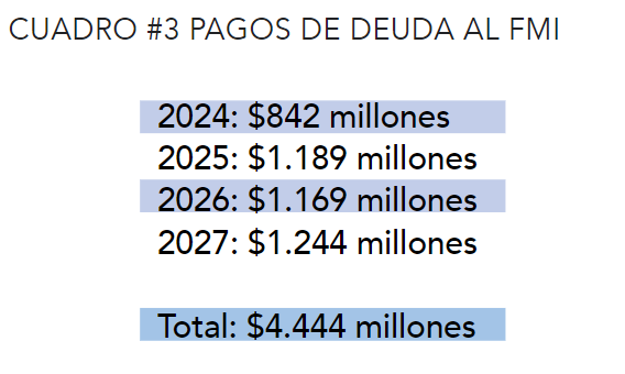 Comentario: Esto último es importante, porque al propio FMI debemos pagarle 4.400 millones en estos años (cuadro #3), es decir que el préstamo sirve en esencia para pagarles a ellos mismos. No es nada extraño, todos los días las empresas y los ciudadanos hacemos eso: pagamos y al mismo tiempo nos endeudamos, o renegociamos nuestras deudas o nos endeudamos en un lado para pagar en otro.