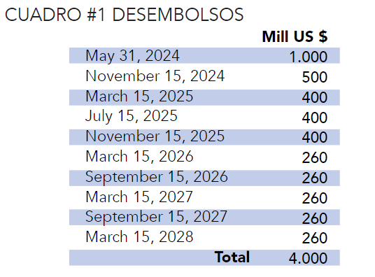 El Gobierno ha alcanzado un acuerdo con el FMI por $4 mil millones, que serán desembolsados en principio según muestra el cuadro #1.
