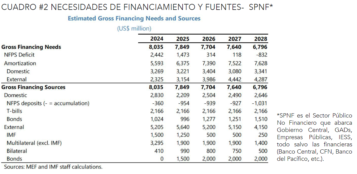 Entre otros objetivos que comentaremos, se espera esto permita (ver cuadro #2) menores necesidades de deuda y un financiamiento más diverso del gobierno ecuatoriano, incluyendo poder volver a los mercados financieros internacionales (1.500 a 2 mil millones desde 2025) porque bajaría el riesgo país. Para el Sector Público No Financiero (SPNF) que abarca todo el gobierno incluyendo al Gobierno Central, esto se generaría partir de: