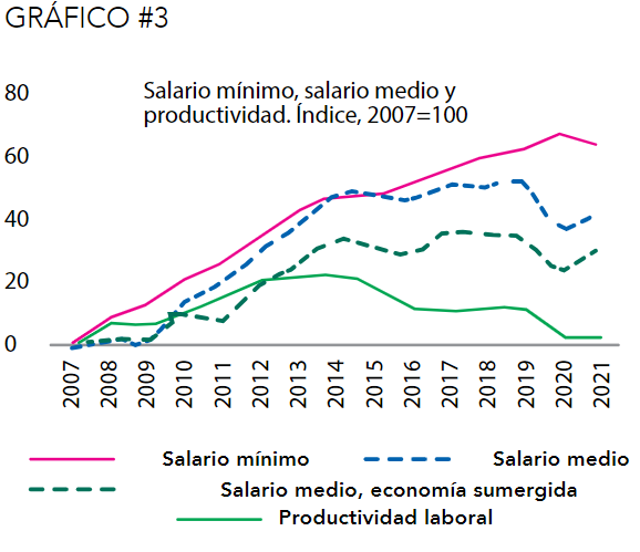 Siete, las reformas del mercado laboral deberían apuntar a aumentar la flexibilidad y fomentar la alta calidad empleo, incluso para los jóvenes. Las fuentes de rigidez del mercado laboral incluyen la rigidez de los contratos, altos costos de separación y salarios mínimos elevados. Fomentar las oportunidades del mercado laboral, también apoyará esfuerzos más amplios para prevenir la delincuencia y la inseguridad” … Estemos conscientes que flexibilización es sinónimo de adaptación entre necesidades de los trabajadores y los empresarios, no de abusos (que pueden darse y deben ser sancionados), y una de ellas es el trabajo por horas que fue rechazado en la consulta. En este contexto, el objetivo no debe ser anclar los empleos existentes, sino ayudar a una más sana transición entre empleos, cuando esto es necesario. Un indicador muy grave es el total desfase entre productividad y salario básico como se observa en el gráfico #3.empleos, cuando esto es necesario. Un indicador muy grave es el total desfase entre productividad y salario básico como se observa en el gráfico #3.