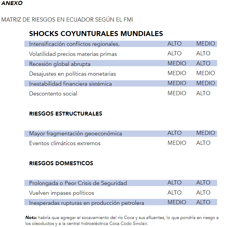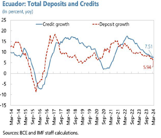 “La agenda apunta decisivamente a incrementar el crecimiento potencial de Ecuador … Se está produciendo una fuerte desaceleración económica. En el cuarto trimestre de 2023, el PIB real se contrajo un 0,7 por ciento (interanual), por debajo del +0,7 por ciento en el tercer trimestre de 2023, en medio de una disminución del consumo privado y las exportaciones netas. Los diversos indicadores continuaron siendo débiles en la primera parte de 2024, al enfrentar la economía importantes obstáculos como una difícil situación de seguridad, la acumulación de atrasos internos del gobierno, postura de política fiscal más estricta y cortes de energía … Se prevé que el crecimiento comience a recuperarse en la segunda mitad del 2024, pero solo promediará el 0,1 por ciento para 2024 en su conjunto, y luego camine hacia su tasa potencial estimada del 2½ por ciento en el mediano plazo”.
