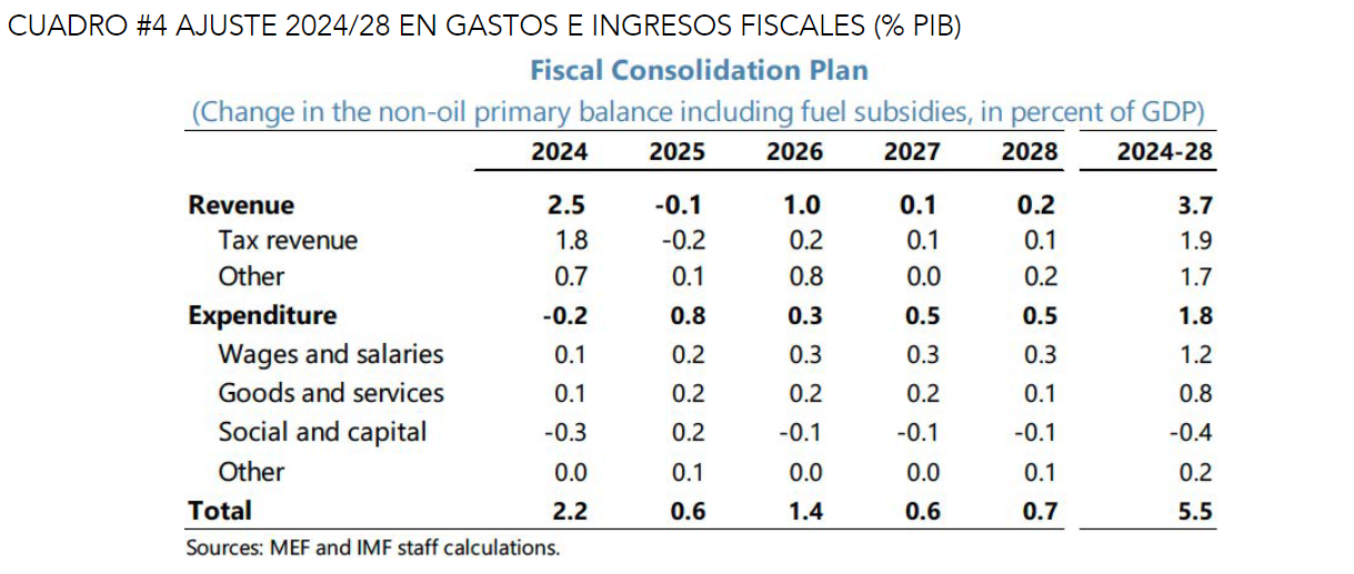 “Las autoridades han implementado una importante movilización de ingresos no petroleros. Se espera que produzcan un aumento neto de 1,8 por ciento del PIB en ingresos no petroleros en 2024. Estos incluyen: (i) un aumento de 3 puntos porcentuales en la tasa del IVA al 15 por ciento; y (ii) impuestos temporales que se recaudarán principalmente en 2024 y 2025. Para garantizar la sostenibilidad fiscal a mediano plazo, se necesitan esfuerzos adicionales sostenidos. Mientras tanto han mostrado compromiso para controlar el gasto público pero manteniendo prioridades alrededor de la seguridad, lo social y la inversión… El plan fiscal dentro del acuerdo tendría como objetivo una mejora en el saldo primario no petrolero del SPNF del 2,2 por ciento del PIB en 2024 y un 3,3 por ciento adicional del PIB durante 2025-28, totalizando el 5,5 por ciento del PIB”.