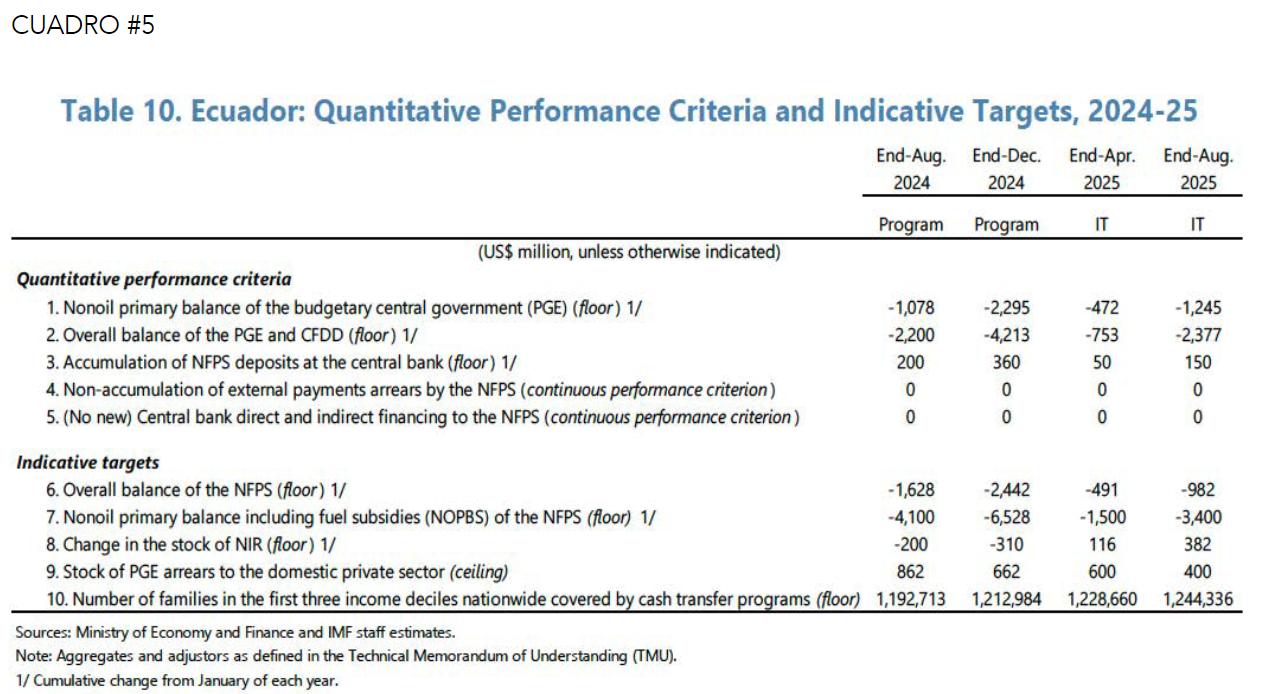 “Sobre la base de los logros del anterior programa de 2020, el nuevo acuerdo tendrá como objetivo (i) fortalecer la sostenibilidad fiscal, protegiendo al mismo tiempo a los grupos vulnerables; (ii) salvaguardar la dolarización y estabilidad macroeconómica; (iii) reconstruir los colchones de liquidez; (iv) mejorar la estabilidad e integridad financiera; y (v) además avanzar en la agenda de reformas estructurales para promover un crecimiento sostenible e inclusivo”.