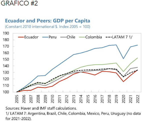 “Durante las últimas dos décadas, el PIB per cápita ha tenido un rendimiento inferior al de pares regionales (ver gráfico #2). Algunos factores que obstaculizan el crecimiento incluyen incertidumbre política, inseguridad, rigideces del mercado laboral e informalidad, engorrosas regulaciones y licencias, limitada integración comercial, desafíos de gobernanza (incluyendo en empresas estatales) y altos costos de endeudamiento”.