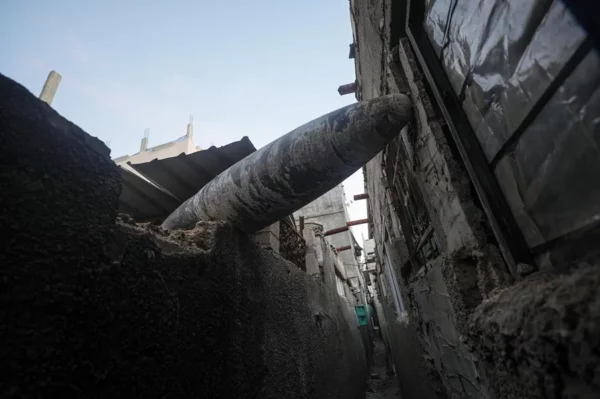 Un misil sin explotar atrapado entre dos casas del campo de refugiados de Al Nusairat, en una imagen de archivo. EFE/EPA/Mohammed Saber