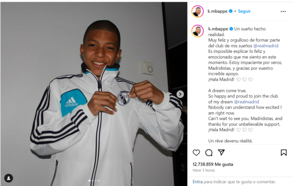 Mbappé se pronunció en su cuenta de la red social Instagram. Junto a fotos de niño con ropa del Real Madrid, él escribió: «Muy feliz y orgulloso de formar parte del club de mis sueños. Es imposible explicar lo feliz y emocionado que me siento en este momento. Estoy impaciente por veros, Madridistas, y gracias por vuestro increíble apoyo».