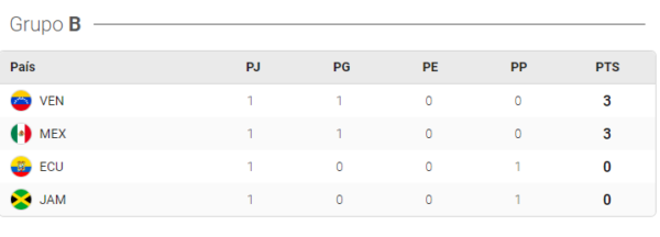 La situación en el B tiene hoy a Venezuela y México como líderes, tras imponerse contra Ecuador y Jamaica por ventajas mínimas respectivamente. Este miércoles 26 de junio quedará más claro el panorama de este grupo porque los dos punteros se encontrarán en el SoFi Stadium de Los Ángeles, pero en el turno previo se encontrarán ecuatorianos y jamaiquinos en el Allegiant Stadium de Nevada.