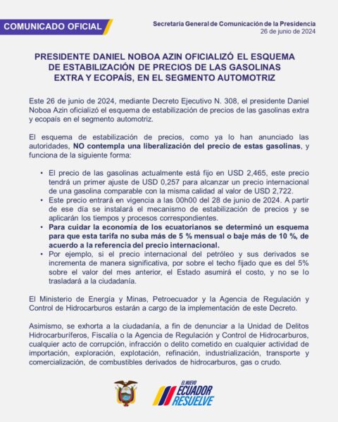 El presidente Daniel Noboa oficializó el incremento al precio de las gasolinas Extra y Ecopaís. Lo hizo este miércoles 26 de junio del 2024, mediante la firma del Decreto Ejecutivo N° 308.