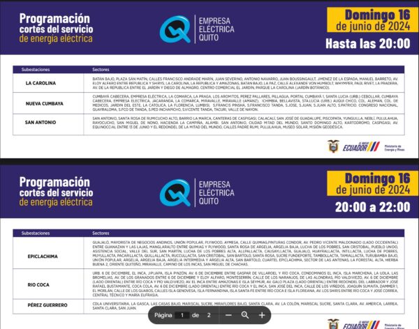 Luque informó que la duración de los cortes de luz y sus horarios serán definidos por las empresas distribuidoras. En el caso de la capital, la Empresa Eléctrica Quito determinó que los cortes serán de dos horas, hasta las 20:00 y hasta las 22:00, en los siguientes sectores: