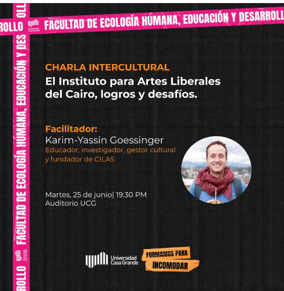 En esta charla, Karim-Yassin Goessinger, fundador de CILAS, compartirá parte de sus logros y desafíos a lo largo de este tiempo; será un espacio para reflexionar sobre vínculos, resonancias y luchas compartidas entre el mundo árabe y Abya Yala, entre Egipto y el Ecuador, con respeto a la pedagogía, saberes ancestrales y conocimientos decoloniales.