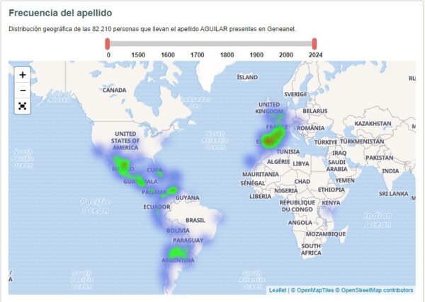 Debe dar clic en ‘Para saber más’ y encontrará información de la frecuencia del apellido en un mapamundi con sombras de color en los países con registro. Y, a continuación, una lista de localidades y cuántos individuos. En el mapa también puede revisar una línea de tiempo para conocer la distribución geográfica desde la antigüedad hasta ahora, el año 2024, o por espacios de tiempo.