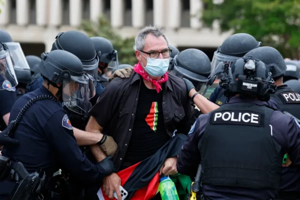 Vista de la policía deteniendo a un hombre que participa en una protesta en contra de la guerra en Gaza en un campus universitario, en una fotografía de archivo. EFE/Caroline Brehman