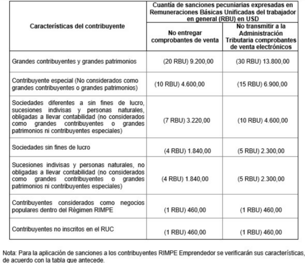 La remuneración básica unificada del trabajador en general (RBU) aplicable al período fiscal 2024 es de 460 dólares. Es decir, la sanción más alta alcanzaría los 13 800 dólares.