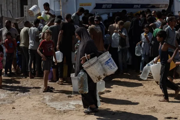 Los palestinos desplazados hacen cola para recoger agua potable de un camión cisterna en el campo de refugiados de Jan Yunis. EFE/EPA/Haitham Imad