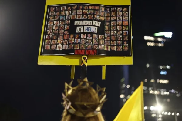 Un manifestante israelí sostiene una pancarta que representa a rehenes israelíes retenidos. EFE/EPA/Atef Safadi